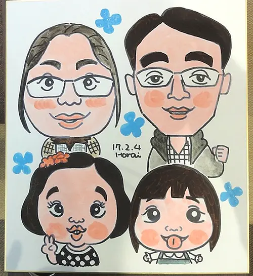 似顔絵師も愛媛県に行くのは初めてだったらしく、今回はとても楽しみながら描くことができたと言っておりました。ご家族での似顔絵はずっと残る思い出になります。ぜひイベントで来店者プレゼントとして似顔絵コーナーを設けてみませんか?