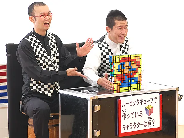 1回目、2回目ともに30~40名の親子連れがシンクロニシティのショーを観てくださっていました。まずは、ディアボロ(中国ゴマ)、ボール、シガーボックスなどを使ってのジャグリングを披露しました。2人それぞれの技術はもちろん、息ピッタリのジャグリングに皆さんからたくさんの「すごい!」という驚きの声と拍手をいただきました。続いて、ルービックキューブを積み上げて絵柄を作り上げるというオリジナル芸を披露。徐々に絵柄ができあがっていくと、子ども達は競うように絵柄のキャラクター名を口々にされていました。その次は、一輪車とバランスローラーに乗ってのジャグリングを披露しました。ハラハラドキドキのバランス芸に、会場は緊張感で満たされましたが、無事成功すると会場は大きな拍手でいっぱいになりました。