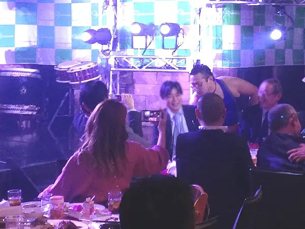 忘年会は午後6時頃から始まり、お笑い芸人・ゴンゾーは忘年会終盤の午後9時前からショーを行いました。