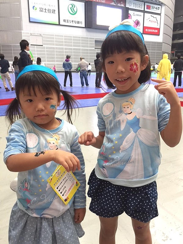 会場となったのはコンサート、ライブ会場として全国的にも有名な「さいたまスーパーアリーナ」でした。当日は社員さんはもちろん、そのご家族も参加されていたこともあり、1,000名近くはいらっしゃたと思います。年齢層も小さいお子様からご年配の方まで幅広かったです。フェイスペイントコーナーは競技が行われるフロアの一角に設置されたので、参加されるみなさんの白熱した様子を見ながらのお仕事となりました。