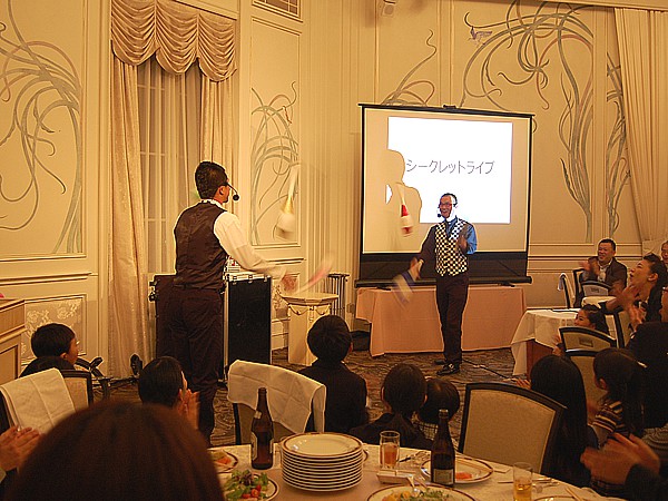 会場となった大阪市内のホテルにはこの春から入った新入職員のみなさんを含め100名ほどの方がお集まりになっていました。年齢層は比較的若く、20代30代の方が大半を占めていました。結婚式も開催することができるお部屋で天井高さといったショースペースも問題なしでした。