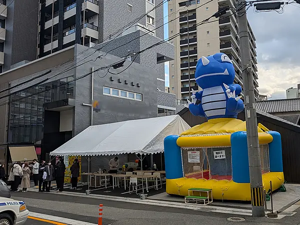 肝心のエア遊具(ふわふわ)はと言いますと、隣のテントで親御さんがネイル体験をしている間にエア遊具(ふわふわ)で遊んで待っていたり。またその逆もしかりで、子供たちがエア遊具(ふわふわ)で遊んでいる間に親御さんはホワイトニング体験をしたりと、皆さんご家族で各々有意義な時間を過ごしておられました。とは言え親御さんの体験が終わっても実際にエア遊具(ふわふわ)から出てこようとするお子さんはほとんどおらず、寒さに反して子供たちにとっても大人気で、連続して遊び続けていると熱気で上着を脱いでしまう子も出てくるほど。親御さんがその様子に「自分たちはこんなに寒いのに!?」と驚かれている場面もありました。結果、エア遊具(ふわふわ)は終日遊んでくれるお子様が途切れることはなく常に大盛況ぶりを発揮していました。
